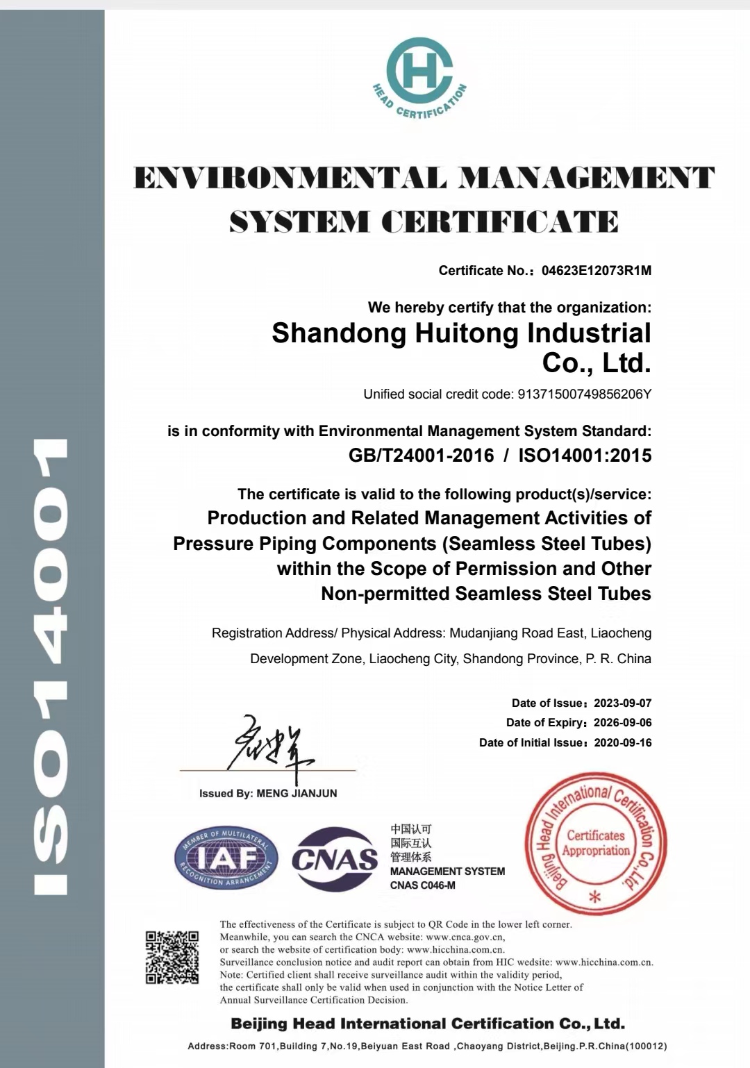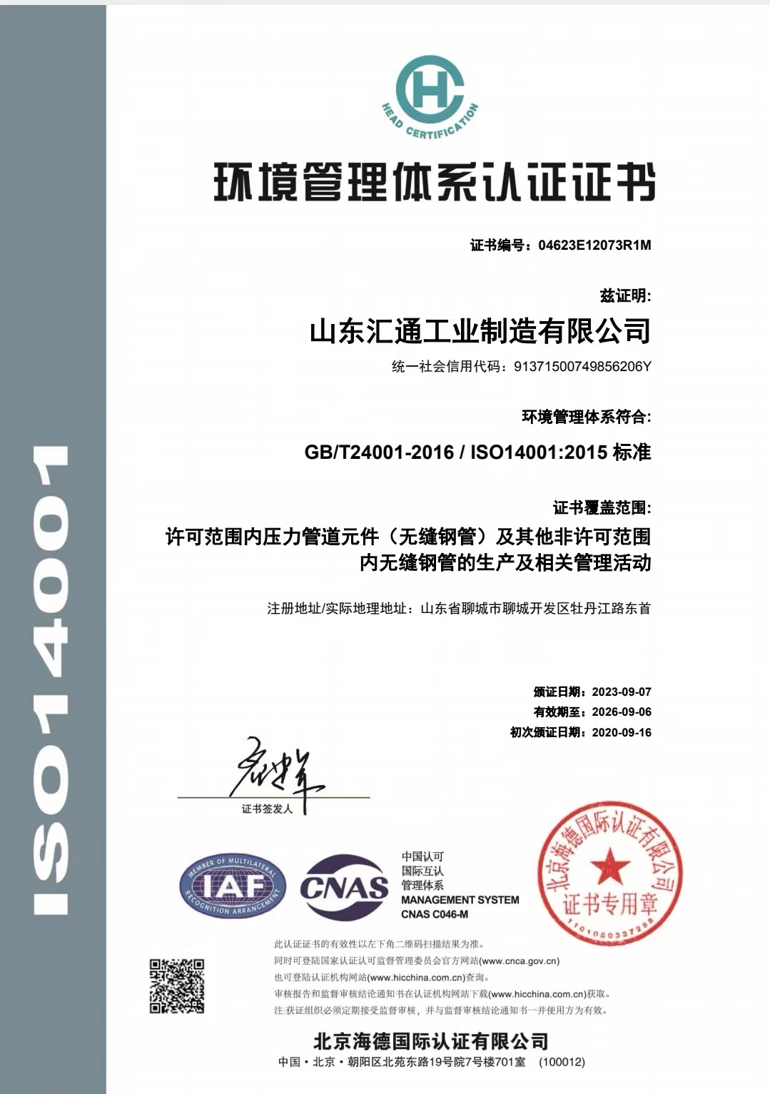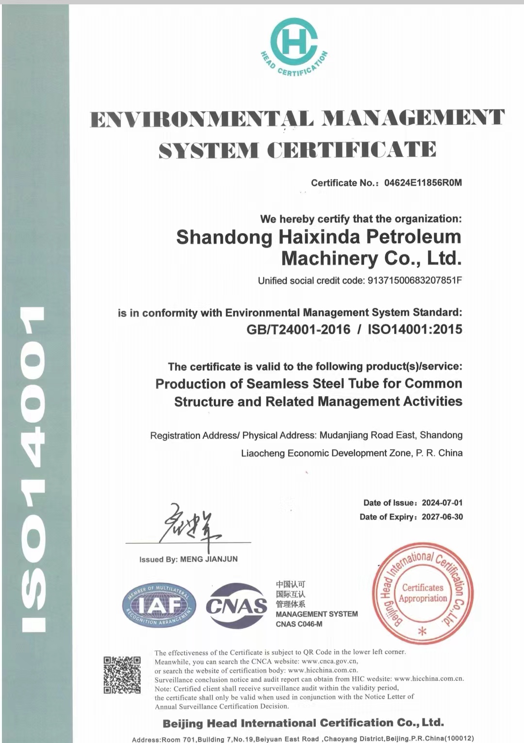 環(huán)境管理體系認(rèn)證證書