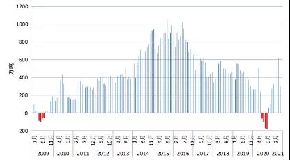 圖2 中國(guó)粗鋼凈出口當(dāng)月情況