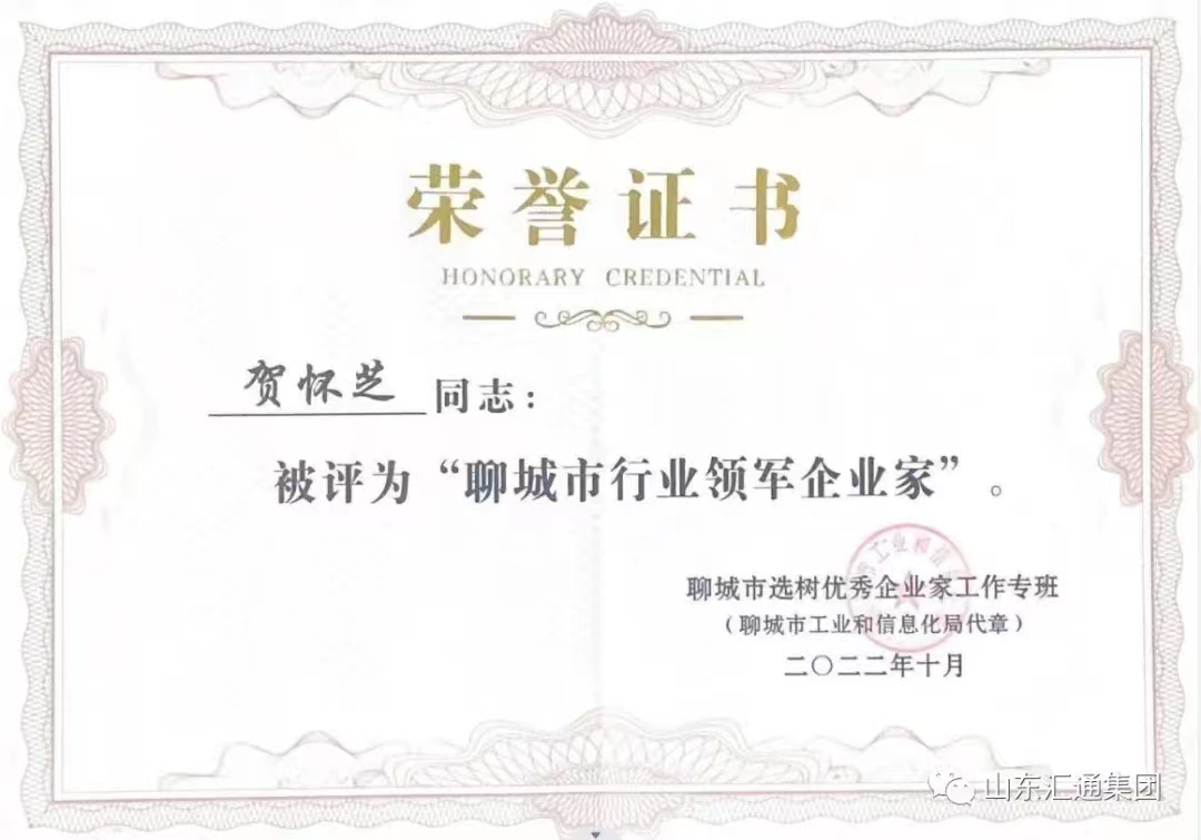 近日,由聊城市委組織部、市委統戰部、市工業和信息化局、市人力資源和社會保障局、市國有資產監督管理委員聯合舉辦的聊城市優秀企業家評選活動中,匯通集團董事長賀懷芝榮獲聊城市“行業領軍企業家”稱號。