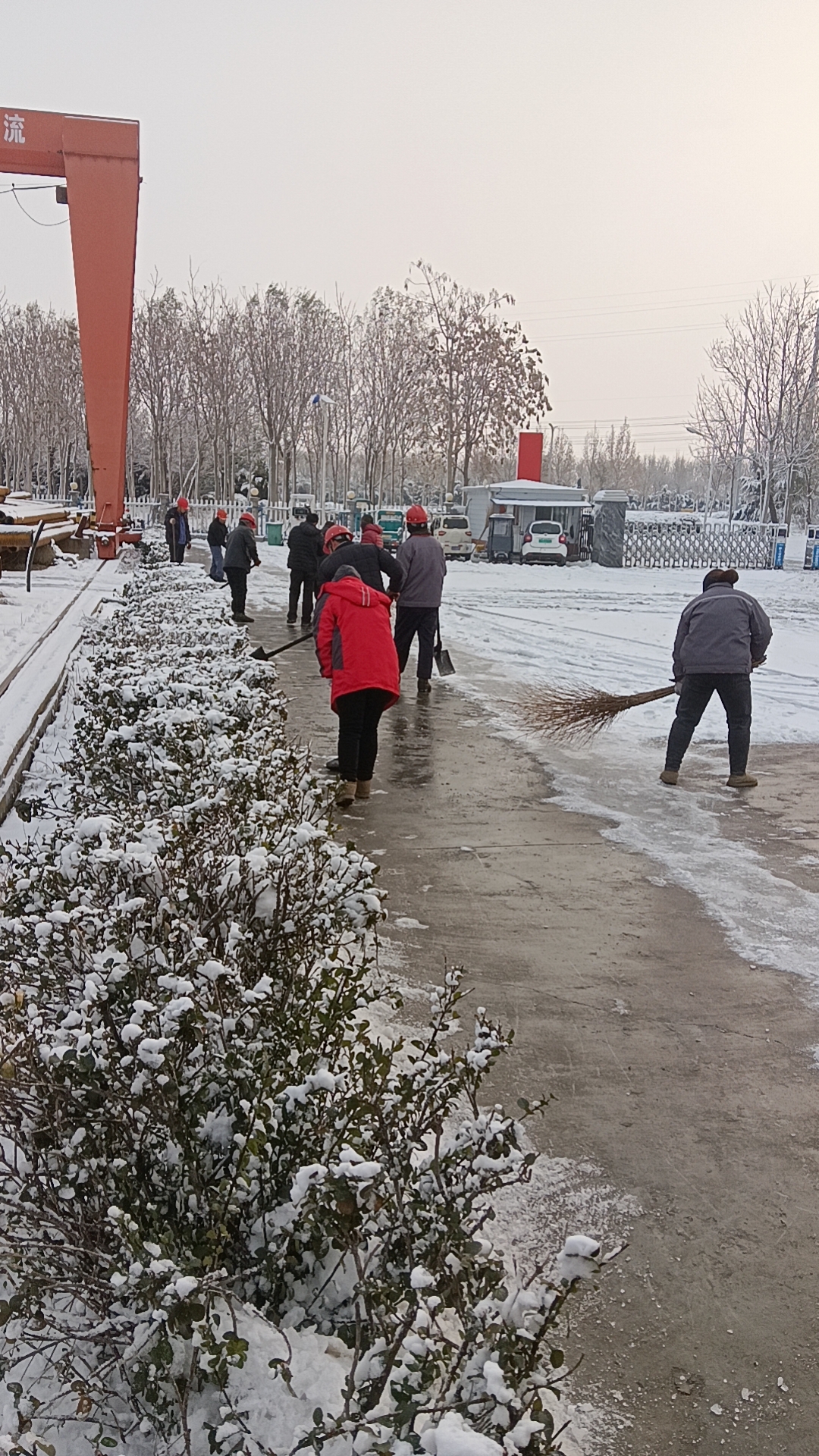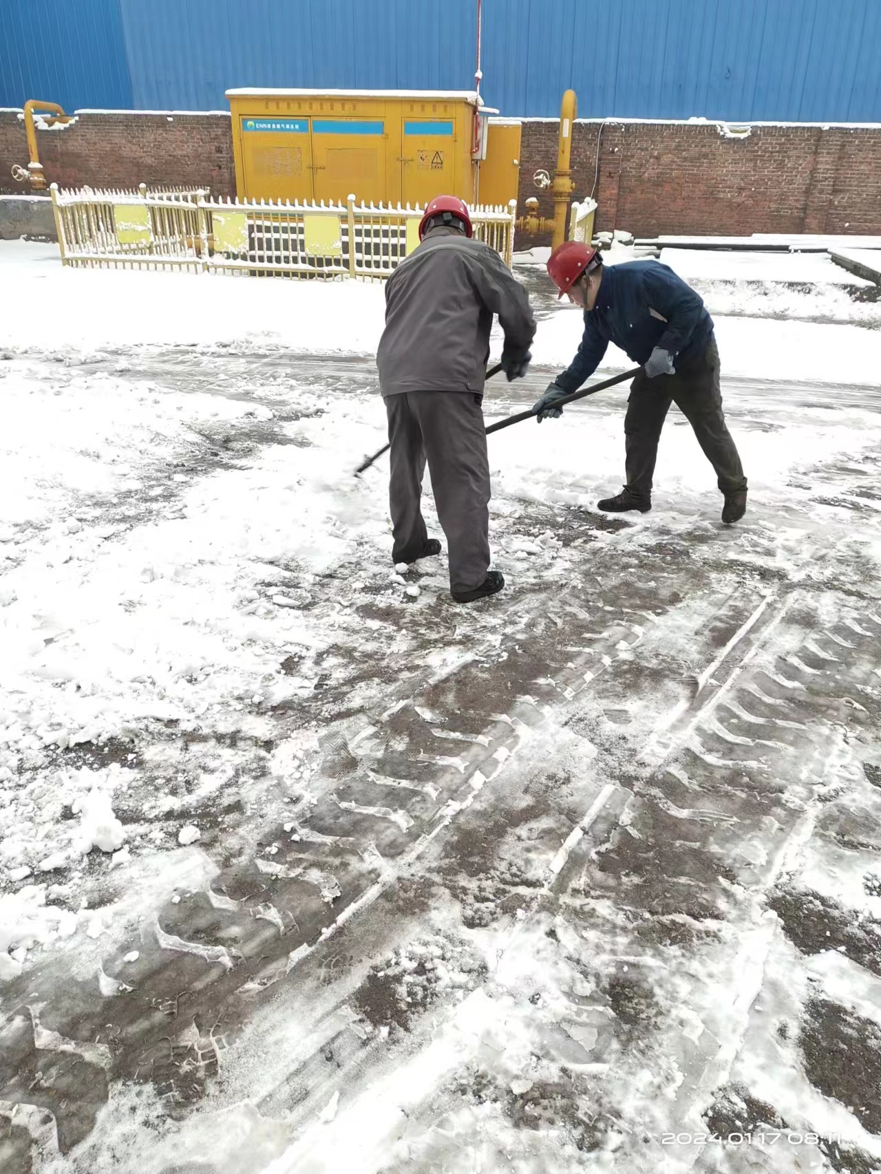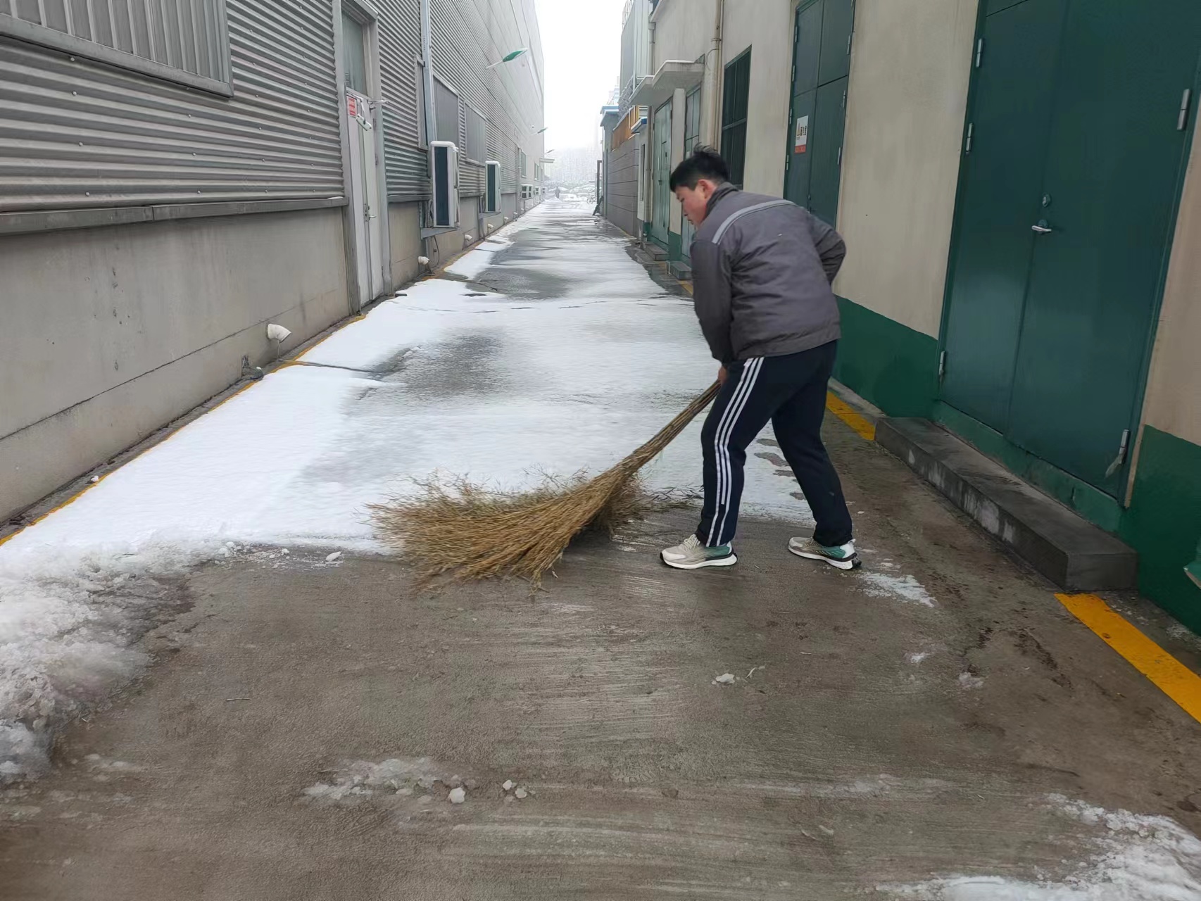 浴“雪”奮戰,不畏嚴寒!各部門、各分廠快速響應,積極組織,人員迅速到位。在集團董事長賀懷芝的帶領下,全體干部職工組成多個掃雪小組,頂著嚴寒,揮舞著鐵鍬對辦公大樓周圍廣場、主干道以及園區外主干道的冰雪進行了清掃。各分廠負責各廠周邊區域,利用換班時間進行清掃。大家齊心協力,配合默契,呼出的白霧、揮動的掃把、忙碌的身影,在皚皚白雪的映襯下,構成一道道靚麗的風景!熱火朝天的干勁兒在嚴寒冬日里散發著溫暖與熱情!冰雪雖厚,擋不住眾志成城;天寒地凍,敵不過勠力同心!經過一個多小時的奮戰,終于將積雪全部鏟除,為員工通行、貨物進出開辟了一條洋溢著溫情的通暢之路。